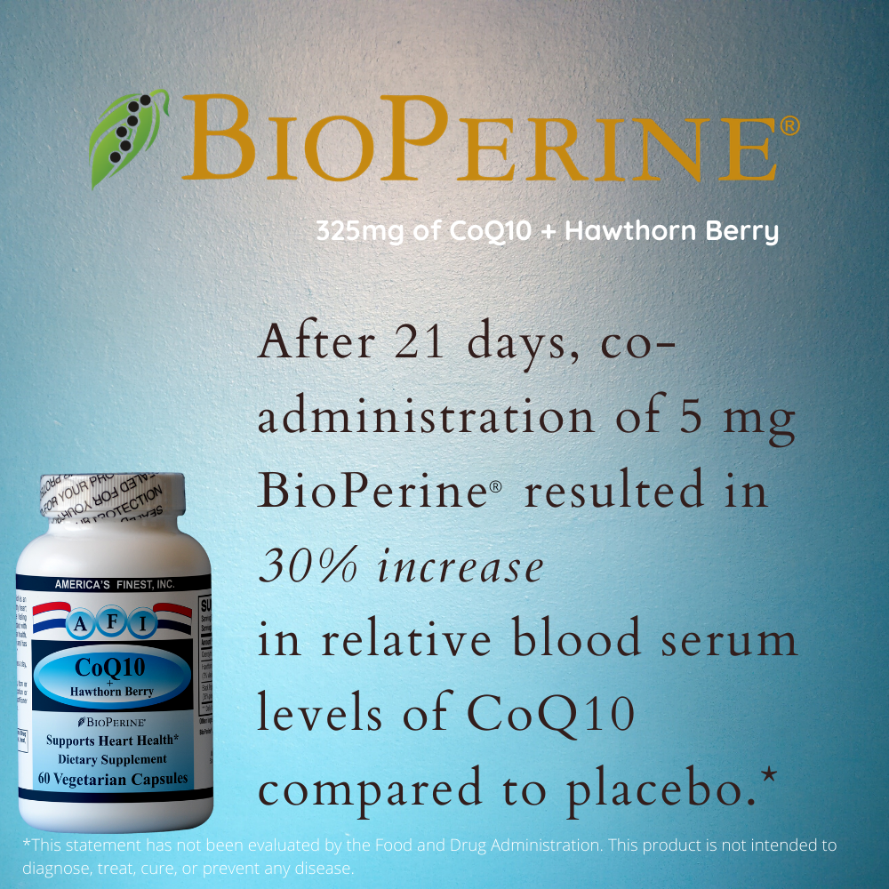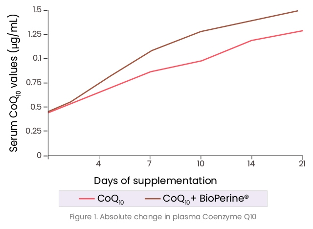 In a double-blind study with 12 healthy volunteers, bioavailability of CoQ10 (120 mg) was evaluated with and without BioPerine® supplementation(3). After 21 days, co-administration of 5 mg BioPerine® resulted in 30% increase in relative blood serum levels of CoQ10 compared to placebo.