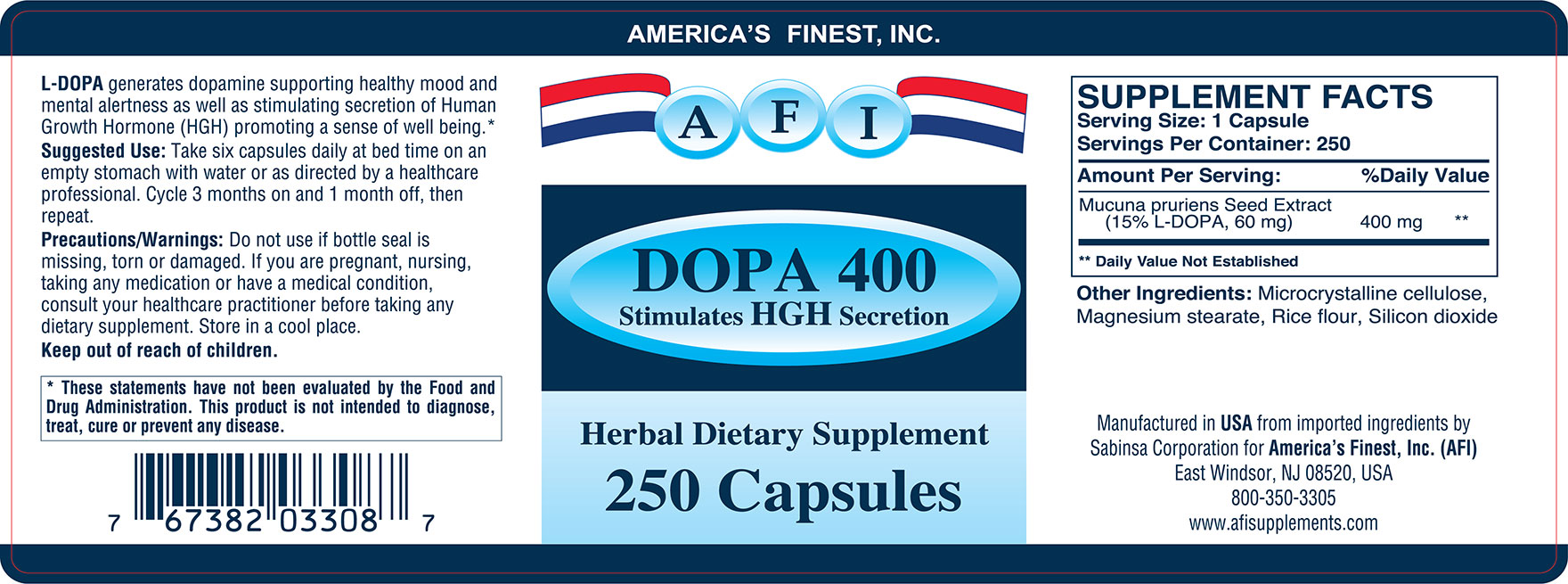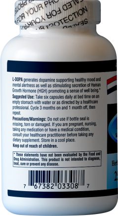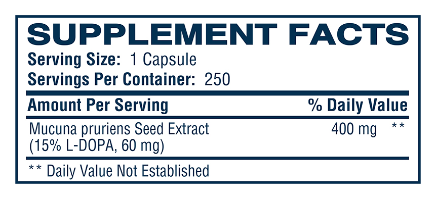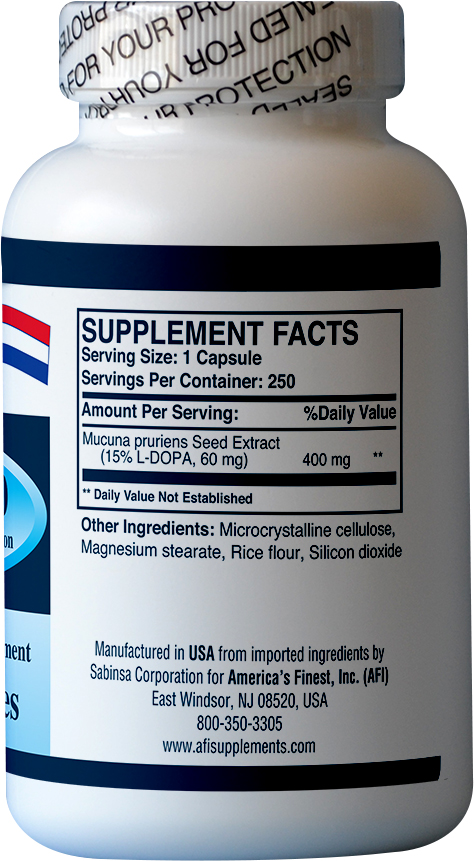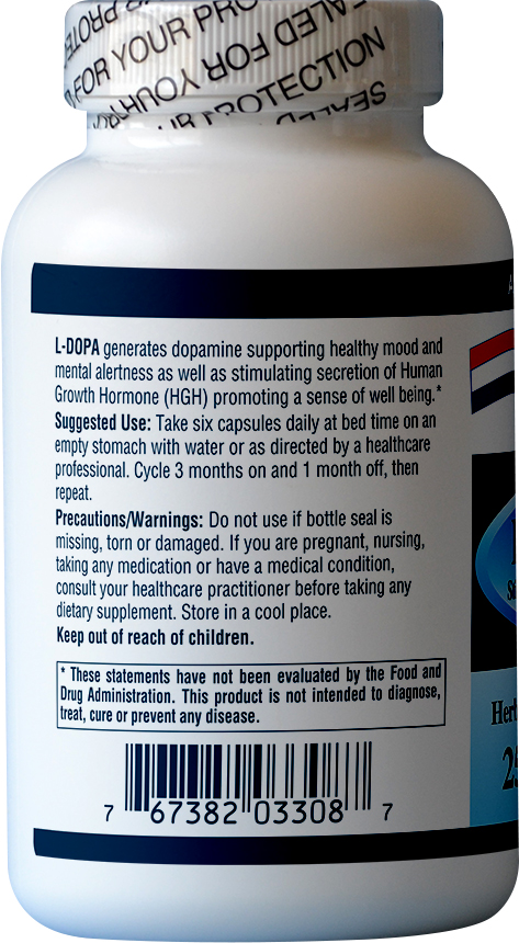 DOPA (also called Levodopa or L-DOPA) is extracted from Mucuna pruriens or velvet bean seeds. It is the precursor of the neurotransmitier dopamine which itself is the precursor of neurotransmitiers nor-epinephrine and epinephrine. DOPA is consumed to generate dopamine; supporting healthy mood and mental alertness. It has been studied in the management of Parkinson’s Disease (PD), a degenerative disorder of CNS where dopamine is not sufficiently produced). In fact it has been found to be a potent agent for symptom management and is associated with an increase in quality of life and longevity for patents with PD, but chronic use causes motor complications. Therefore, management includes manipulation of Levodopa dosing to establish the optimum outcome. It has been known for over 40 years that L-DOPA is an effective stimulant of Human Growth Hormone (HGH) which has many benefits including improved sense of well being, increased muscle mass and protein synthesis, increased fat reduction, higher energy levels, increased endurance, increased flexibility, increased libido (sexual performance) and improved immune function.