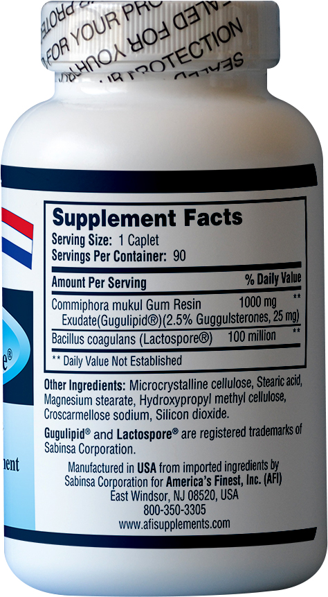 Gugulipid® is extracted from gum of Guggul, Commiphora mukul. Several clinical studies have shown effectiveness of Gugulipid for decreasing LDL (“bad cholesterol”) and triglycerides.