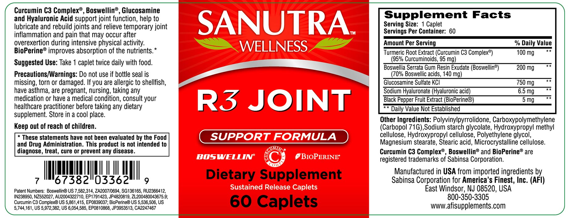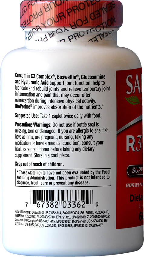 R3 Joint Support Formula combines the powerful joint health herbs, Curcumin C3 Complex (Turmuric Root Extract) and Boswellin (Boswellia) with Glucosamine and Hyaluronic Acid to form a unique product that supports joint rebuilding, lubrication and pain relief.